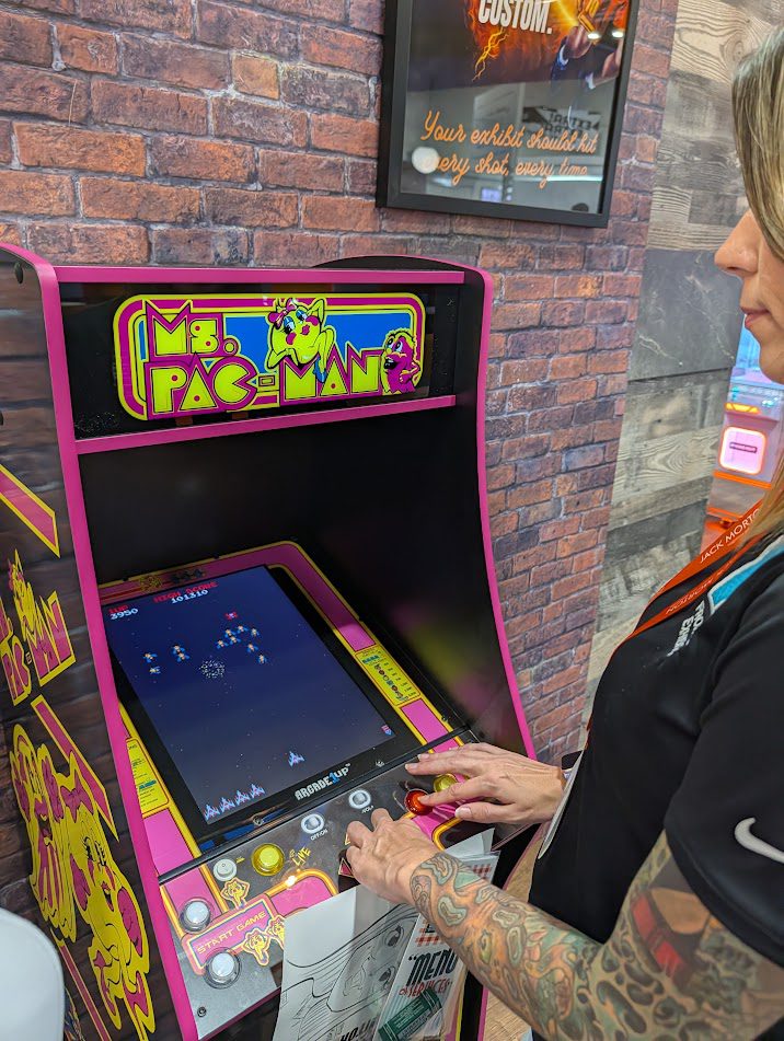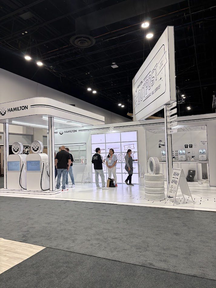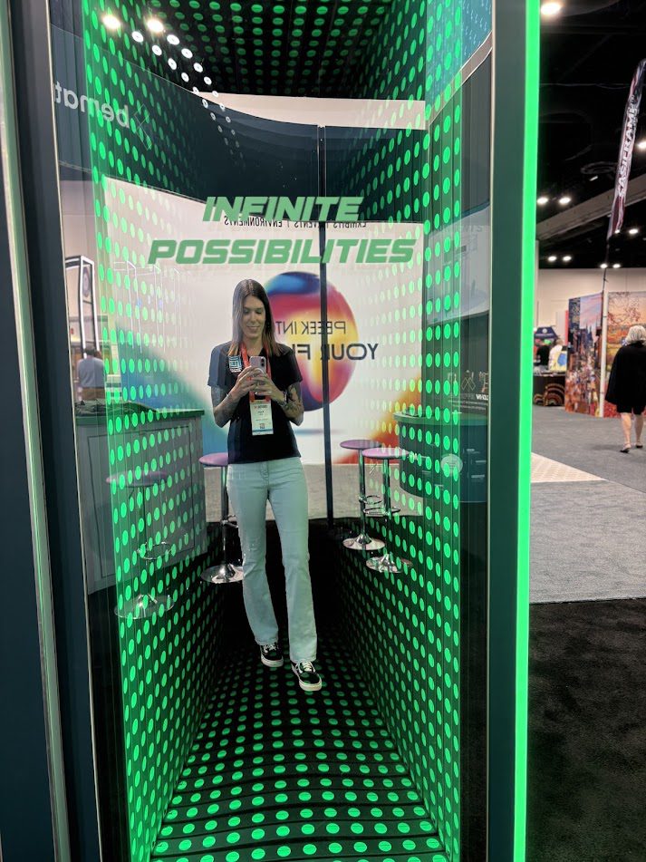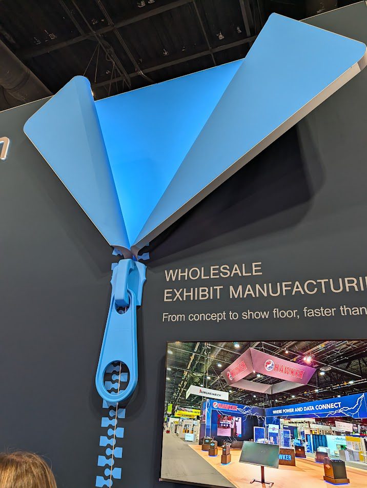 Kayti mentioned that her biggest takeaway was the show’s overall creativity. Each booth was unique in its look and feel and did a great job of explaining who they were and what they did. Most of the booths showcased new or key products and let you experience them firsthand. Many of the booths, beyond their visual appeal, used creative tactics to draw in and engage attendees. Some examples were a claw game like you’d see at an arcade, a touchscreen spinwheel for prizes, and even a foot massage! Some of the booths had themes that helped you understand further the ethos and broad messaging of the company they represent, like Classic Exhibits’ “Bigfoot” theme. Highlighting capabilities within the scope of the booth design was also clever and helpful. Such as the Modco private meeting spaces and the AGAM 3D-printed zipper. Other companies, like Hamilton’s black-and-white space, used visually nuanced designs to draw you in. Caricatures drawn by both people and AI, big floating balls, and an old reliable coffee bar were used to grab attention as well.